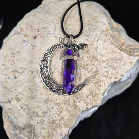 Halskjede med dyrehodeskalle. Inkludert et håndlaget resin anheng med gullfolie, glitter, og fargepigmenter.