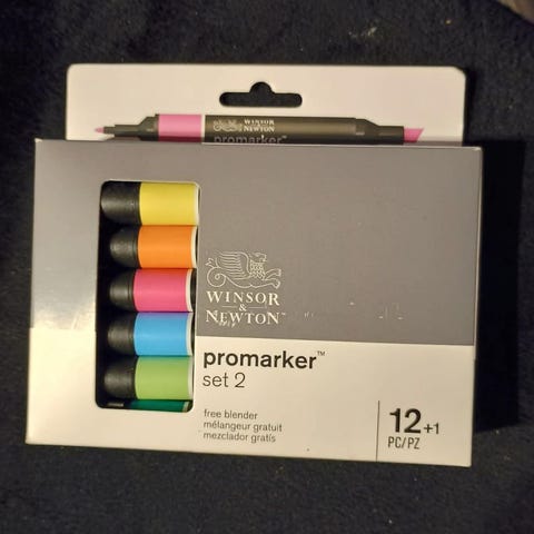 Tusjene er lett brukt, kun noen få farger er testet – resten fremstår som nesten ubrukt.