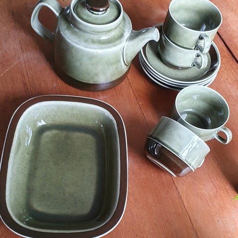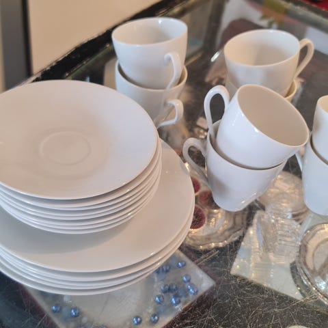 Totalt 9 deler: 5 kopper og 4 asjetter. Derav 1 asjett og 3 kopper (4 deler totalt) i veldig god stand. 🌟 Resten har små skår eller krakelering. Pene, klare farger.