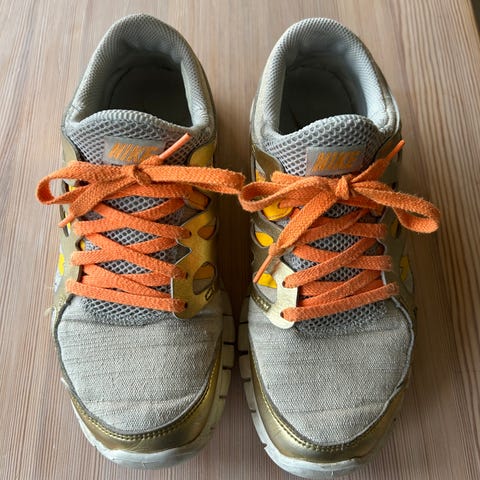 Hoka løpesko i størrelse 38, beige farge. Skoene er designet for løping og har en pustende overflate. Materialet gir støtte og komfort under bruk.