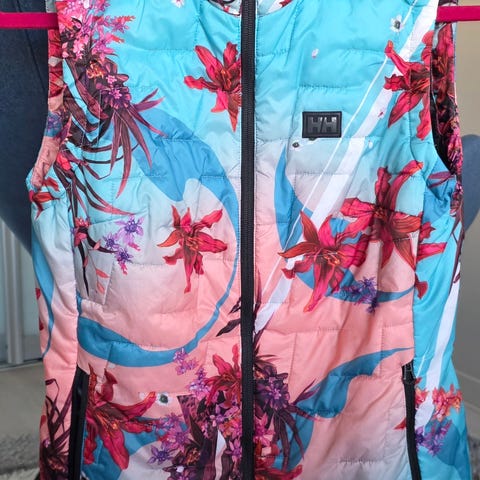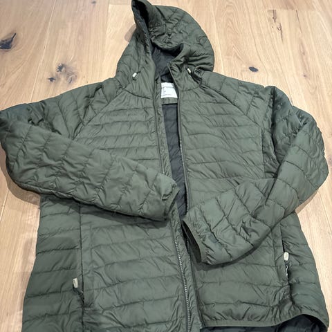 Synlig brukt, har et lite hull på venstre skuldra. Fór: 62% polyester, 38% bambus