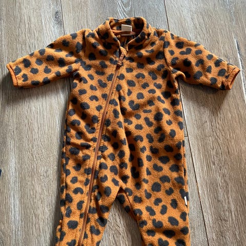 Fleecedress fra Lindex størrelse 56. Mørkegrønn med tremotiv. Hender og føtter kan brettes over.