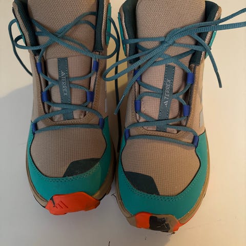 Adidas Fotsport sko i størrelse 38, designet for fotturer. Skoene har en turkis farge og er laget med Gore-Tex materiale som gir vanntetthet og pusteevne. Egnet for utendørs bruk og turaktiviteter.
