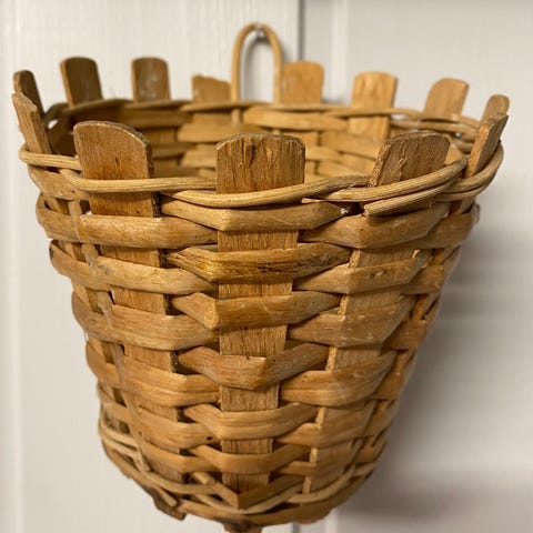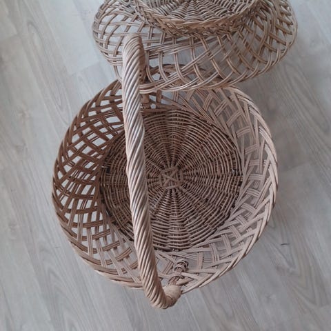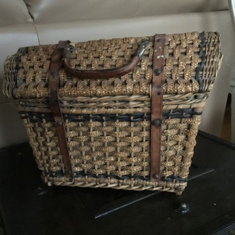 Kurv laget av flettet materiale med et enkelt håndtak. Kurven har en oval form og er egnet for oppbevaring eller transport av små gjenstander.