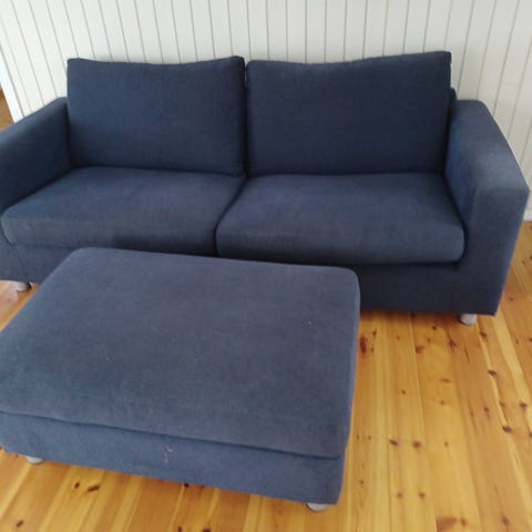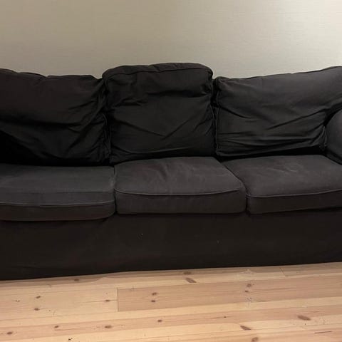 Komfortabel og solid 3-seter sofa. Sofaen har stabile armlener i tre og slitesterkt stoff. Putene er faste og holder formen godt. Må hentes. Hjelper til med bæring.