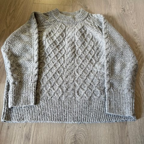 Flott og deilig genser med flettemønster over hele bolen, ermene og nederkant.