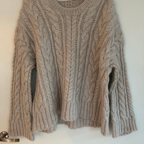 Beige farge i str S, men genseren er stor og passer M og L også. Det er vide ermer som er litt kortere.