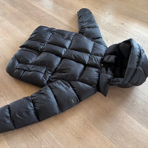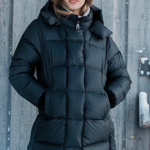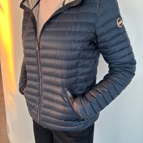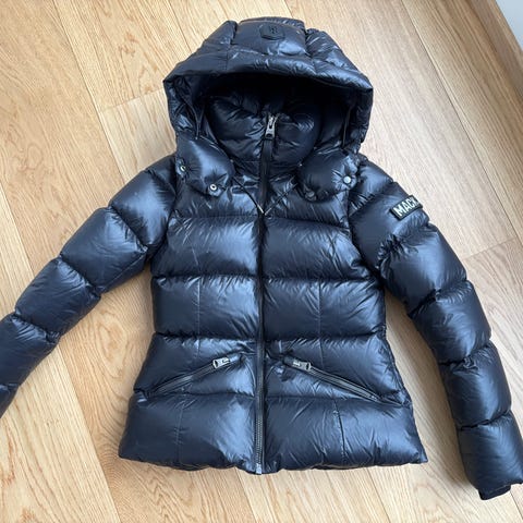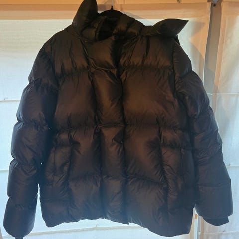 Den har et supermykt vannavvisende yttermateriale, lett dunisolasjon med 800 fill power, og innvendige magnetersom holder frontklaffen lukket. En elastisk snor nederst lar deg justere passformen etter humør eller vær, mens bomullsribbede mansjetter holder varmen inne"