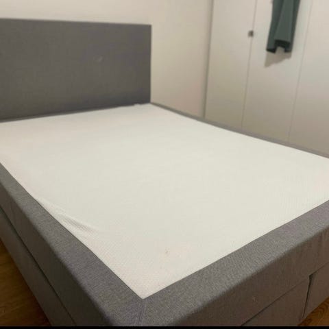 Sengen består av sokkel, 2 ramme og 2 madrasser inni en felles trekk og nylig vasket overmavermadrass.