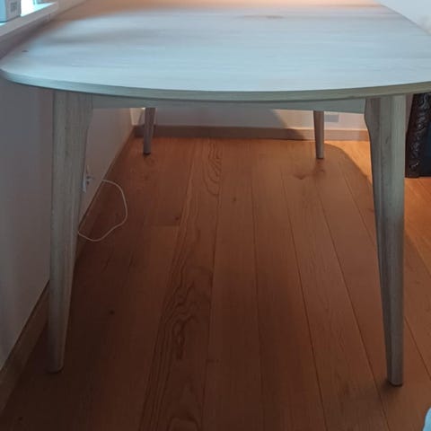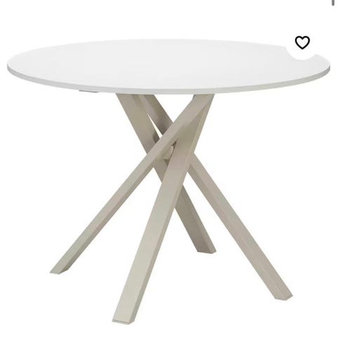 Hvitt høyglans spise bord fra skeidar. Pent brukt, kjøpt i 2023, selger den pga plass mangel etter flytting. Den ble veldig stor til leilighet. To små bruks skader, på kanten, som vist på bildet. Men uten det , er bordet helt fin. Enkelt å ta ut tillegsplate, som for lenger bordet 50cm.. som det er vist på bildet.