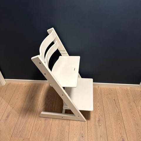 Stokke Tripp Trapp i hvit. Stolen har et justerbart sete og fotstøtte. Den er fra 2015 og er godt brukt, men med mye god igjen. Må hentes.