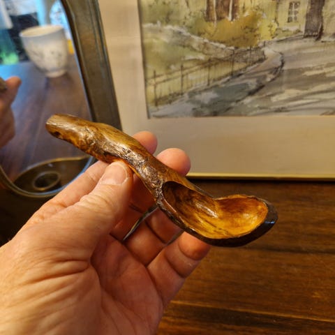 Organisk og naturlig spesial skje som er naturlig syrnet ute i skogen. Den er matsikker og kan brukes til det meste, ihvertfall til å få vanskelige rester ut av glasskrukker.