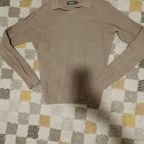 Dressmann genser for herre i størrelse S, laget av bomull. Genseren er mørkeblå og har en ribbestrikket tekstur med krage.