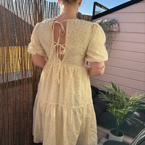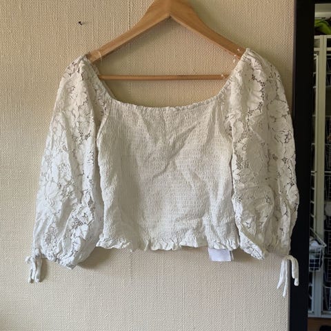 Bluse i sateng med en langt erme. Blusen er hvit og har et v-hals snitt. Den har smock-midje.