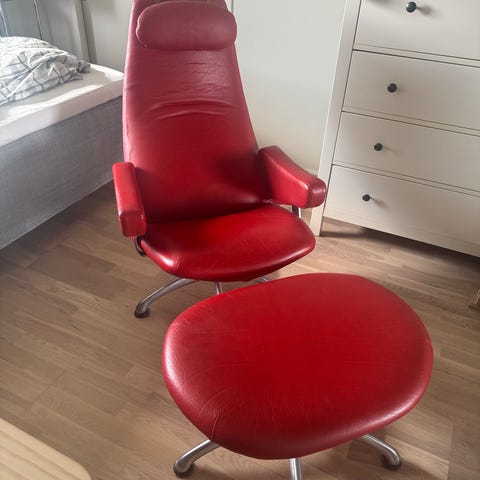 Selger en kjempefin Brunstad Sting lenestol med tilhørende skammel i nydelig spesialbestilt rødfarge. En elegant og svært komfortabel stol med tidløst design og rene linjer.