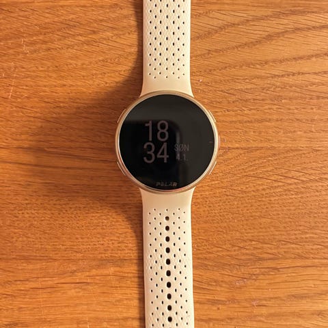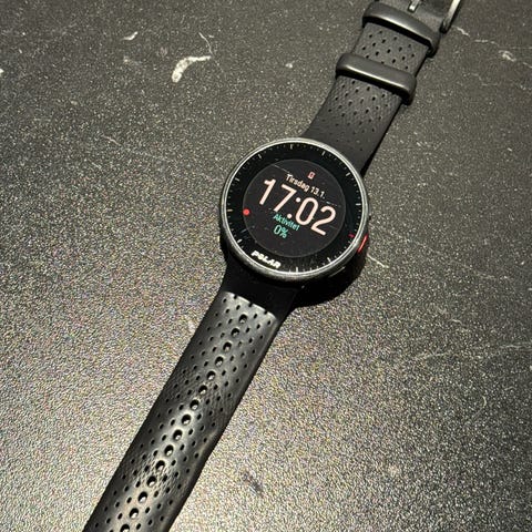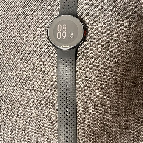 Polar Pacer Pro smartklokke i svart farge. Klokken har en rund urskive og et svart armbånd i silikonmateriale. Egnet for bruk til trening og daglig aktivitetsovervåkning.
