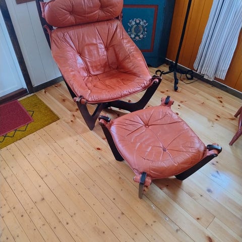 Retro Hjellegjerde skinnstoler av designer Odd Knutsen fra 1970-tallet selges. Modellen heter Luna og er et velkjent design fra denne tidsperioden. Stolene er i svært god stand, ser nesten nye ut! Veldig god sittekomfort.