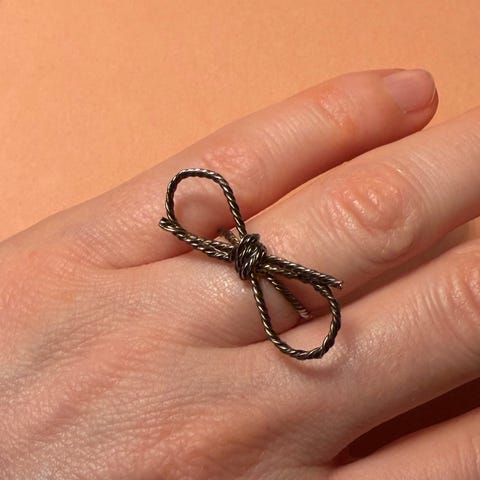 Unik statement-ring med sløyfe-/knute-design laget av flettet metall. Ringen har et grafisk og skulpturelt uttrykk, med hengende detaljer som gir bevegelse og karakter. Et smykke som virkelig skiller seg ut, samtidig som det er overraskende anvendelig i styling.