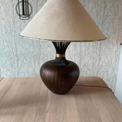 Pen og solid bordlampe i klassisk utførelse. Lampen har fot i messing/metall og lys tekstilskjerm med diskret mønster. NB. Må hentes.