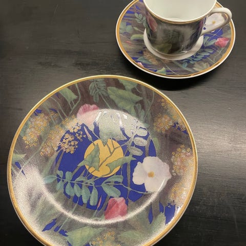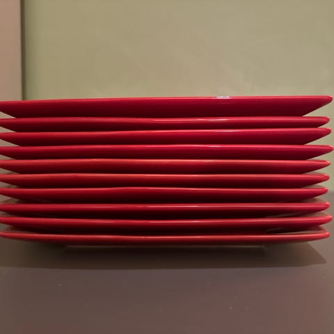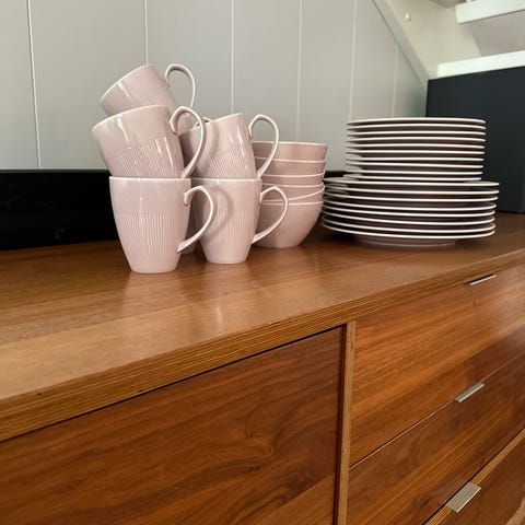 Skeidar servise i hvit med dekorative striper. Inneholder ulike typer tallerkener, egnet for servering i hjemmet eller andre sammenhenger.
