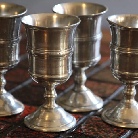 Historiske replika-drammeglass i støpt tinn! Kopier av drammeglass funnet på fregatten "Lossen" som forliste i 1717 ved Hvaler. Produsert av Askvoll Brug.