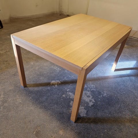 Selger flott spisebord i Eik, med flott sittebenk og to fine stoler i mørk farge med sitteputer. Spisebordet kan utvides til cirka to halv meter med ekstra bordplater som følger med.