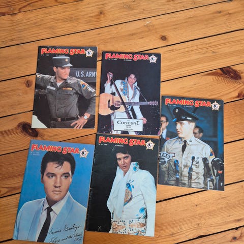Selger en flott samling på 18 originale Flaming Star‑blader, utgitt av den norske Elvis Presley Fan Club. Dette er autentiske fan‑klubb‑magasiner fra perioden 1978 til og med 1982, en av de mest etterspurte epokene blant samlere.