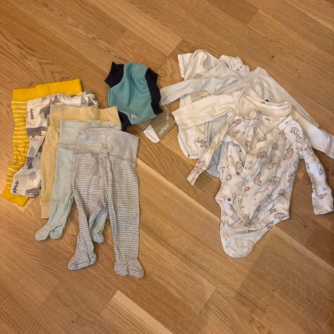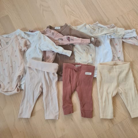 To sett med matchende body og bukse (+1lue), 6 pysj, 7 body, 4 bukser og en ullstrømpebukse. Har også flere body/bukse i str 50 - hvis ønskelig kan det legges ved :)
