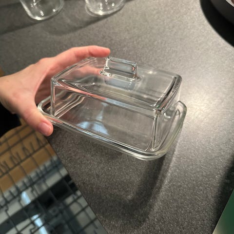 IKEA smørboks laget av klart glass. Egnet for oppbevaring av smør og andre pålegg. Har et lokk med håndtak for enkel åpning og lukking. Et funksjonelt kjøkkenutstyr for organisering av matvarer.