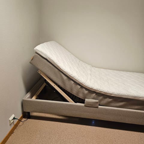 Enkeltseng med fjernkontroll. Overmadrass følger med. Sengen kan heves i hode og fotenden. Må hentes.