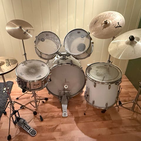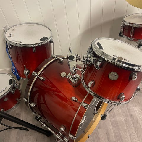 Komplett trommesett, Mapex V, selges med trommekrakk, stikker, og alt som skal til for å komme i gang. Helt greit trommesett i rimelig prisklasse som har blitt brukt som øvingssett i mange år, og brukt sporadisk på spilling. Selve trommene er fra ca 2010, men i god stand. Noe gamle stativer, noe nyere. Hihat og ride er ganske ny. 22" stortromme, 14" skarp, 12-14-16 tam.