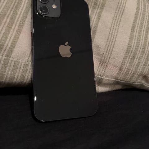 Apple iPhone 12 mobiltelefon med 128 GB lagringskapasitet i svart farge. Telefonen er pent brukt men noen skraper på siden og en på skjermen ellers hel og pen. Passer til bruk som smarttelefon med flere funksjoner. Batteritilstand på 79%, har også boksen