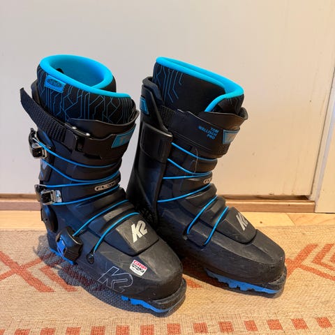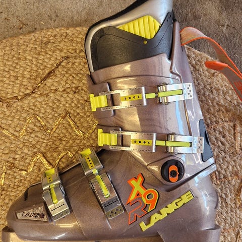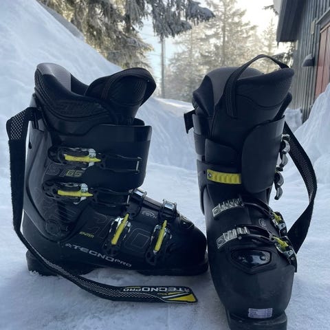 Lange Force alpinstøvler i størrelse 27,5. Støvelen er gul og har tre spenner for justering. Veldig lite brukt