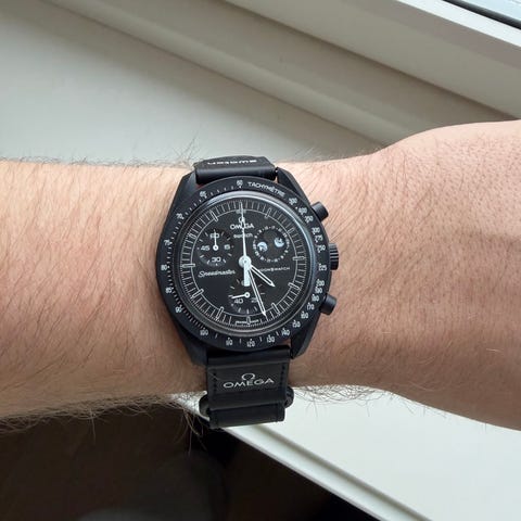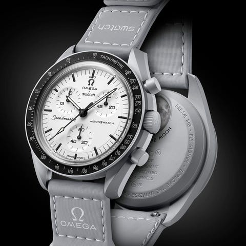 Selger en hvit Omega Speedmaster Mission to the Moon klokke.
