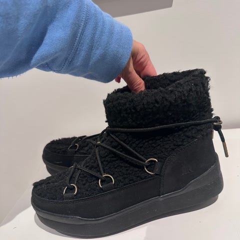 Svarte, kne høye vinter støvletter, i boblestoff med tykt fõr i hele støvletten. Brukt et par ganger. Str 38