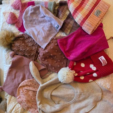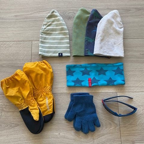 Klespakke selges med caps (9m-2 år, god i str), ull lue strikket ca 3år, 2 høst/sommerluer ca 4 år, 2 par tynne sommervotter unisex, vintervotter str 2-3år (brukt også str 4år), strikket votter ca 3 - 4 år og ørebeskyttere ca 5-7 år.