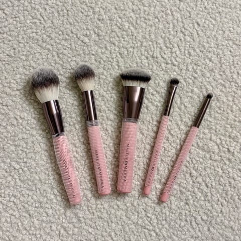 Settet inkluderer fem profesjonelt designede børster for foundation, pudder, øyenskygge, lepper og blush, pakket smart i et slankt etui med innebygd speil.