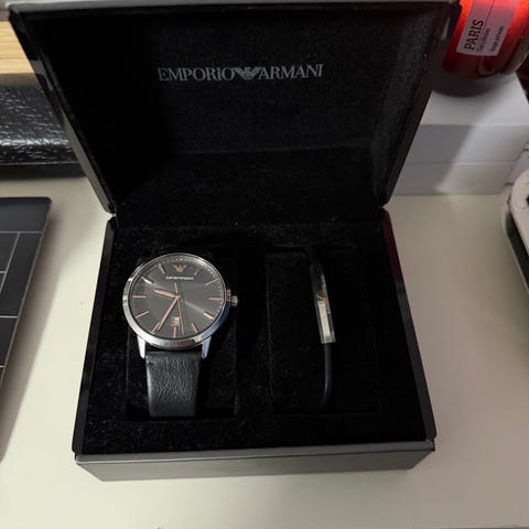 El emporio herreklokke med svart urskive og svart skinnreim. Klokken har et robust design med tydelige tall og markeringer, samt flere funksjonelle kronografer. Leveres i original eske.
