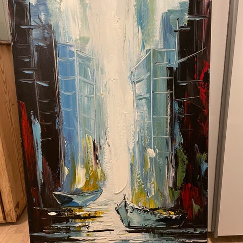 Abstrakt i svart ramme med motiv av et ansikt i varme farger som oransje, blått og beige.Maleriet en moderne og fargerik design, egnet for veggdekorasjon i hjem eller kontor. Str 40x50