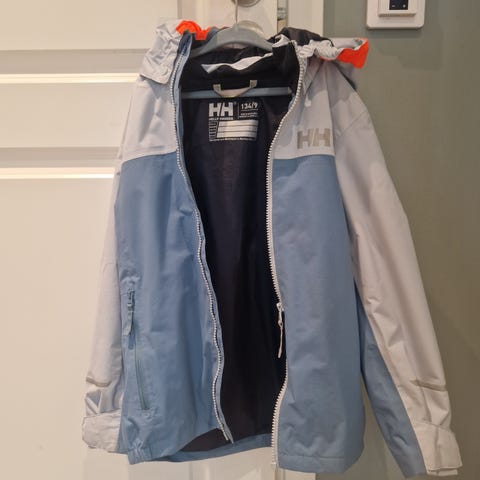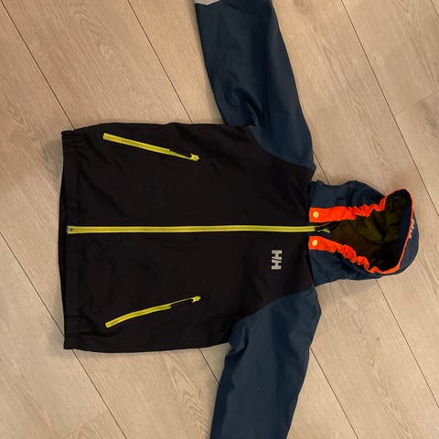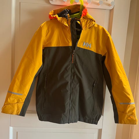 Skalljakke fra Helly Hansen, str. 134. Super jakke som vi kjøper igjen og igjen i alle størrelser ettersom barna vokser. Vanntett og vindtett, avtagbar hette, refleksdetaljer. Anbefales! Enkelte normale bruksmerker, men i god stand.
