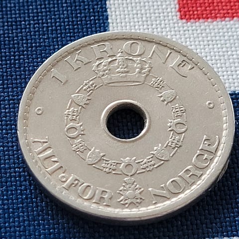 Norges 1 krone mynt fra 1925 med hull i midten. Mynten har inskripsjoner og dekorative elementer på begge sider, inkludert kongelig krone og årstall.