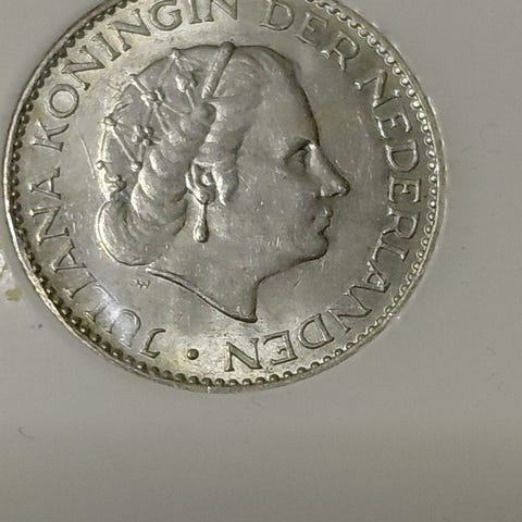Nederland 1 Gulden mynt fra 1956 med motiv av dronning Juliana på den ene siden og riksvåpenet på den andre. Mynten er laget av metall og har en diameter som passer vanlig myntstørrelse.