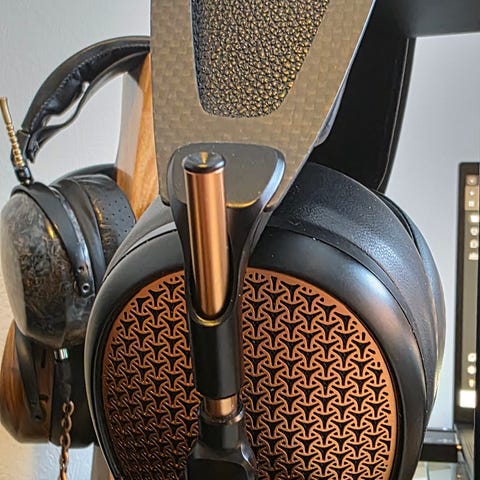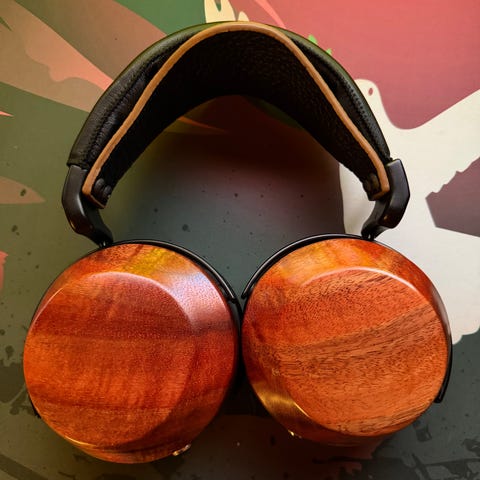 ZMF Atrium Open A-stock i Redheart-tre. Hodetelefonene har ruby magnesium chassis, ruby B.B.B. strap og gunmetal plated-steel grilles & rods. Kjøpt Juni 2024 fra Arkaudio som del av ZMF Hot Cup Summer 2024 (levert oktober 2024).