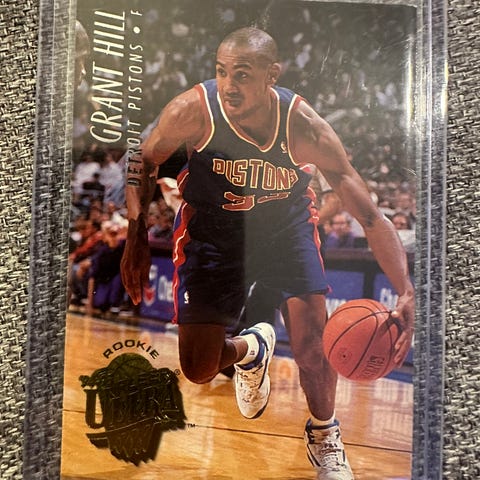Selger 54 stk. forskjellige Basketball kort fra div. serier og årganger. Det er 45 base kort og 9 insert. Kortene er I god kvalitet. Sender med kortholder mappene. Mange gode spillere blandt kortene som, Grant Hill, Kevin Garnett, (9 stk.) Dominique Wlkins, Anfernee Hardaway, (19 stk.) Dennis Rodman, (4 stk.) Gary Payton, (4stk.) Vin Baker, Scottie Pippen, (3 stk.) Dikembe Mutombo, (2 stk.) Chris Mullin, Hakeem Olajuwon, Charles Barkley med flere. Mye bra kort her. Selger for 540 kr.