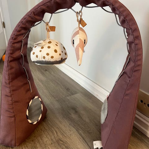 Babygym i nøytrale farger fra Done By Deer. Trekket kan vaskes i maskin. Følger med 4 tilhørende leker. Speilet har noen skraper (se bilde) ellers i fin stand. Brukt til et barn.