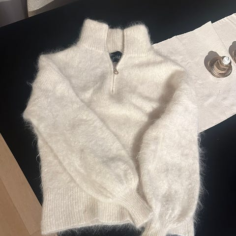 ella&il Andre genser i grå farge, laget av mohairull. Toppen har en one size-størrelse og en unik design som dekker skuldre og overkropp. Passer for kvinner. Koksgrå/ charcoal, nypris 1499. Kun brukt en gang.