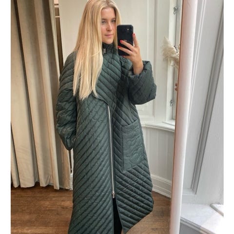 Mango sin fantastiske quiltede kåpe med belte, i fargen army green.