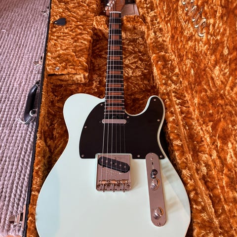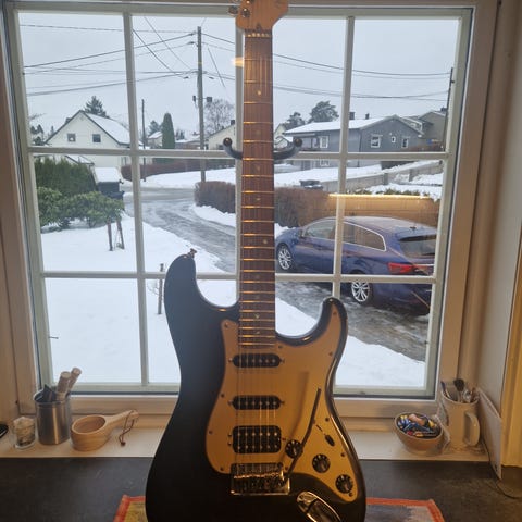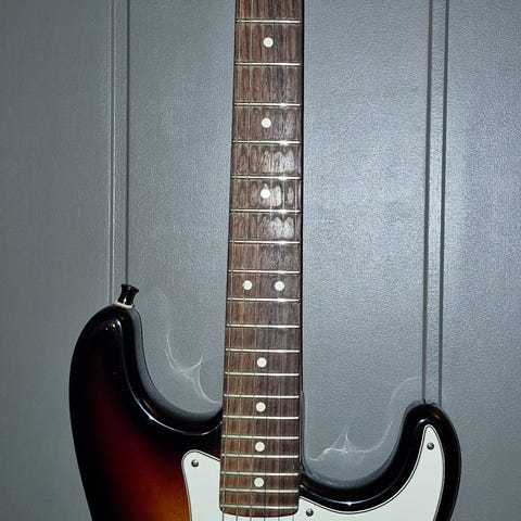 Dette er en Fender Stratocaster-gitar i en sunburst-finish.