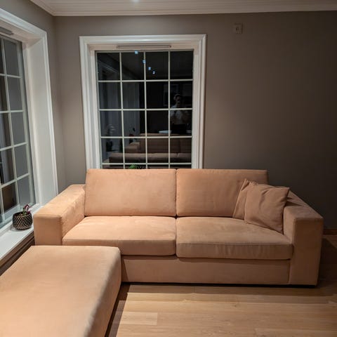 Sofaen er komfortabel å sitte i og kan også brukes som gjesteseng. Normal bruksslitasje, men hel og fin uten hull eller skader.