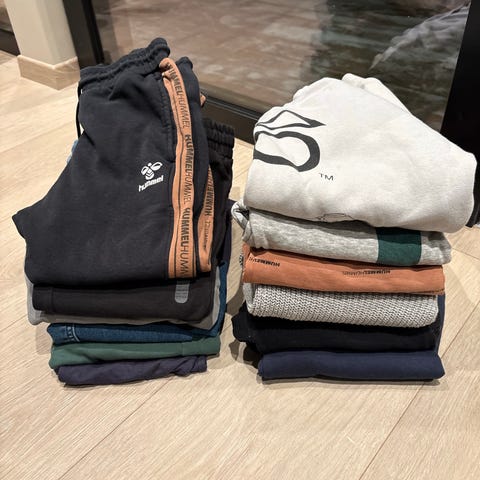 barneklær for gutt i størrelse 134, 140 og 134/140. Klærne består av ulike plagg som passer for barn i denne størrelsen: bukser, gensere, tre fleece-sett, penskjorte, turbukse, turjakke mm. Merker som Hummel, H&M, Lindex, Cubus, Garcia. Selges samlet. Farger: blått, grått, svart, hvit, beige, grønn.